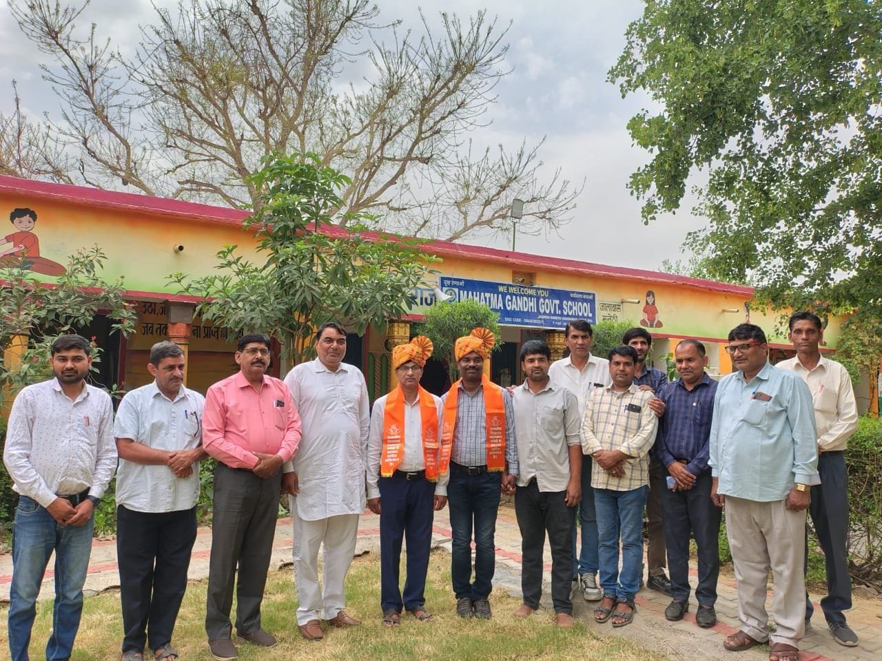न्यूज चक्र (रमेशचंद्र) नीमराना, मुंडावर उपखंड के महात्मा गांधी राजकीय विद्यालय जालावास मनेठी से पदोन्नत हुए गोपीलाल उपप्राचार्य से प्राचार्य बनने एवं राकेश सिंह वरिष्ठ अध्यापक से प्राध्यापक बनने की खुशी में ग्राम विकास समिति अध्यक्ष दयाराम यादव के नेतृत्त्व में शनिवार को ग्रामीणों एवं विद्यालय के स्टाफ सदस्यों द्वारा उनका साफा एवं पटके के द्वारा सम्मान एवं अभिनन्दन किया गया व दोनों के द्वारा विद्यालय के सर्वांगीण विकास में उनके योगदान की प्रशंसा की गई।