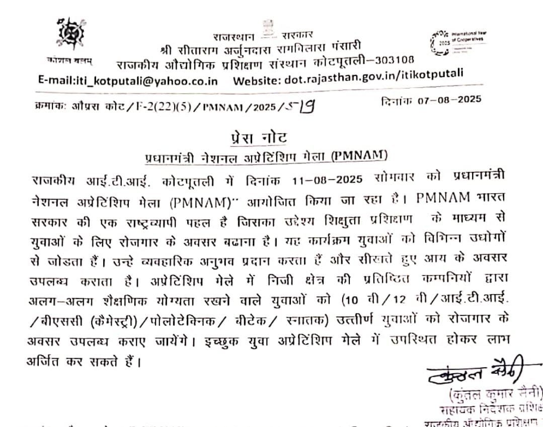 कोटपूतली में 11 अगस्त को होगा प्रधानमंत्री नेशनल अप्रेंटिसशिप मेला