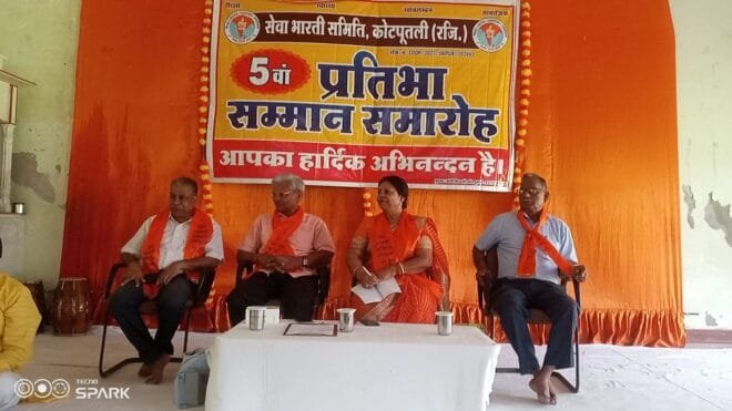 न्यूज़ चक्र, कोटपूतली। सेवा भारती समिति कोटपूतली द्वारा राजकीय विद्यालय में कक्षा दसवीं एवं 12वीं में प्रथम स्थान प्राप्त करने वाले विद्यार्थियों का सम्मान समारोह आयोजित किया गया। जिसमें कोटपूतली ब्लॉक के सभी राजकीय विद्यालयों के विद्यार्थी सम्मिलित हुए। कार्यक्रम में सुमन बंसल (अध्यक्षा जयपुर प्रांत) ने मुख्य वक्ता के रूप में सबको संस्कारित शिक्षण के साथ विभिन्न गतिविधियों में भाग लेकर श्रेष्ठ व्यक्ति बनने के लिए प्रेरित किया।